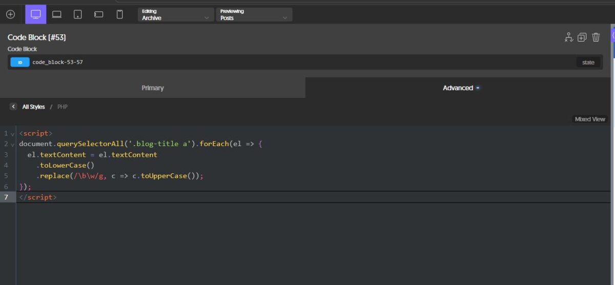 <script> document.querySelectorAll('.blog-title a').forEach(el => { el.textContent = el.textContent .toLowerCase() .replace(/\b\w/g, c => c.toUpperCase()); }); </script>